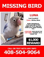 Escaped its cage and flew to nearby trees on Mich Bluff Drive & Turret Drive on Hikido Drive near Hostetter area.