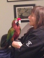 he is multicolored, green and blue with some red and yellow ,he is friendly , i believe scared and confused.. he is used to loud noises and loves classic rock, ..answers to Paparah .good morning ..hello…..mama….cumhere cumhere …mama any of these, he is very vocal and calls out. he is 8 or 9 years old. its been 5 days yesterday he was around all day within a 1/4 mile radius around my house.. i thought he would come home, but he was gone this morning, then we saw him a 1/2 mile from my place , heading away from my house , he was heading north …that was the last sighting ..main st rt 70 in lancaster center at 11 am on nov. 28.
