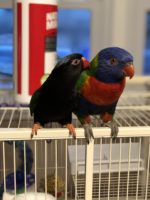 Rory is a black irridescent melanistic Stella’s Lorikeet. She moves with quick movements like a wild bird and chirps like a wild bird as well. She is not hand tame, but if she knows and likes you, she will do a fly by over your head and answer when you call. Skittles is a male Rainbow Lorikeet, He came from a large seizure in a hoarding situation and had a liver condition, which has mostly resolved with healthy diet and exercise, however, he does tend to keep his flights short and occasionally crashes or lands on the ground. If this happens, he will step up for me, but I don’t know if he will do so for anyone else. He may gently murmur, lower his head and flutter his wings to beg, or he may call in a loud screech for Rory or a known person. He also says “hello”, but it is in a very low muttering voice that may be hard to distinguish. Most of these behaviors are unlikely if they are scared, but might as well mention them. They subsist on a diet entirely of nectar and fruit and cannot eat seeds, but may take a very small fruit pellet specially made for lorikeets. The priority is spotting them and letting me know immediately, so I can bring food immediately. I will bring their cage, which is very large, if you are willing, because it is familiar to them, and they may go back inside before they would come to anyone, including me, if scared.