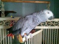 Nyles is a female and is very social with people and animals, and will greet both with”hey buddy”. Barks and meows, also burps, sneezes, coughs, among other rude noises.(lived with a man before I got her) Prefers women and will attack men when outside of her cage.