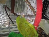 Guinevere is about 6″ long. She is friendly and will sit on a hand or shoulder. She sometimes says “seed” or “seed seed seed” when she is hungry.