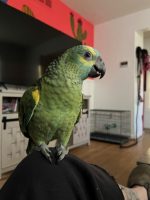 Crosby is still a baby, but a big baby and a fantastic flyer. She talks- hi, hello, what, huh, where are you, why. She is very friendly and clingy. She has recall training and comes to her name- she got lost when a cold wind startled her which caused her to fly off my shoulder. As she was looping around to fly back to me, vultures started chasing her- I lost her in the darkness.