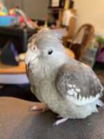 Zoe is a very friendly all gray and white cockatiel who is tame and people friendly. she will respond to her name being called and she is trained to step up on your finger if you offer it to her.