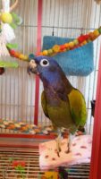 Sterling is a very timid bird when it comes to new people. She enjoys all types of food including fruits, but her favorite is bread and seeds. She whistles a lot, and can say some basic words, like hello and step-up. She has a very distinct “honk” if you will that sounds like something from the amazon that would not sound like anything you would hear in our town. Her whistle is also very different than most wild birds and can sometimes be very high pitched. She can also cluck and laugh.