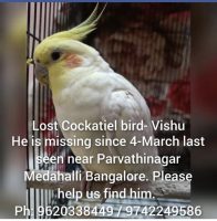 Lost my cockatiel yesterday 4th March 2022 at 12:30 pm and he is 2.4 years old and he often does iPhone ringtone and calls his own name Vishu/vishukutty please if found contact us :9742249586/8792817844