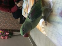 My parrot is a medium size light greenish bird . He is having red colour spots on his wings , a long tail and a light reddish and yellow Peak from bottom.
