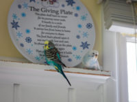 He is the bird on the left in front of the plate (turquoise and yellow).