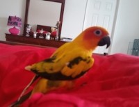 His name is MUMU (moomoo), love to make loud noise, but maybe to exhaust when you found him. Typical Sun Conure, red face (on top of the head, there is a little bold spot), bright orange belly, green colors along his wings.