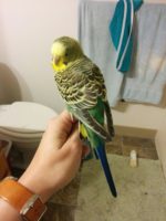 Yellow head, green body, blue tail. will land on your hand or shoulder, is most comfortable on your shoulder. She will nip if scared