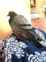 Splits is a 1 year old domestic pigeon with splay leg and a missing toe. He does not have a leg band on. Splits cannot walk to stand well, it takes a lot of effort for him to stand on 1 leg like in the photo, but you can see the missing toe in this photo. Splits can fly.