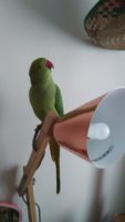 Green Indian Ringneck female, mostly tame, is afraid of men but tends to like women.