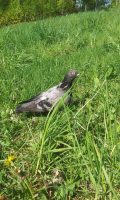 She is primarily grey with 2 fairly large black stripes on her wings, a large white stripe of feathers on her back and she has a mix of dark coloured feathers on her front.
