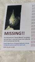 Smash mouth Is an older cockatiel that is mostly gray with a yellowish face and yellow and gray in his comb. He is older and can fly but not far at all. He is a beloved family bed and we miss him dearly.