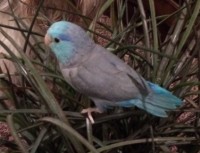 Smaller than a parakeet, has short tail feathers. Is a boy – has vivid blue coloring on back under wings