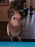 Opal is a 1 year old white and gray cockatiel. She is friendly but cautious of new people. She lives to sing the Andy Griffith song. She was due to have wings trimmed next week so she flies fairly well. She’s a sucker for millet.