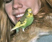 Parakeet is green with yellow belly and dark blue tail. Wings are not clipped. Cere is a dark, crusty brown color and he is about 4 1/2 years old. He answers to Oscar and standard bird whistle calls.