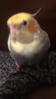 Cheesecake is a one-year old female cockatiel. She has light yellow feather on her front neck, and gray with yellow on her stomach. The end of her wings are black, and she has a yellow crest.