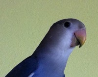 Blue lovebird with purple wings a white face and a spec of white on the top if his head