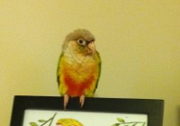 He was gone just over 24hrs when I got the call. He was found sitting on a car in a driveway 2 1/2 blocks from my house. He stepped up on her hand and ran up her arm to her shoulder and she took him inside. Since they didn’t have any birds they put him in a live trap with a wooden dowel and water. Yes I said a live trap – a raccoon trap to be precise, but that was a really good idea. Then when to the store and bought some cockatiel seed. She said they looked in the newspapers lost and found and had called several pet stores. Their daughter came over and decided to look at Craigslist and she saw my ad and photo. I drove over and picked him up.