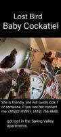 She is 5-6 months old, she is gray with white and yellow, hHer little face is like gray with a little yellow. On her wings at the bottom it has small yellow spots. And her tail is gray with yellow. She whistles the cockroach, my mother taught her in Spanish.
