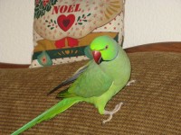 He says pretty bird. If you say his name,”dollar” he will say it back. All green with a black ring around his neck. Red beak.