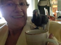 Elle is 4.5 years old. She is dark grey with a pale grey breast. Her tail feathers are maroon. She vocalizes in the morning and evening has a several word vocabulary but is not conversational. She is very gentle and will warn you if you are infringing and not welcome. She was raised from a hatchling and socialized by a woman. she responds to “Hey, Bird”, “Sweet Girl” “My Girl” and “El”