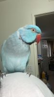 He’s a blue Indian Ringneck that flew out of the apartment while my mom was taking out the trash around midnight. He already has his black and white ring around his neck. He has recently molted, so he still has an empty patch of no feathers at the back of his head and he still has some small pin feathers on his wings. He is not chipped nor does he have a band on his leg. He is timid and friendly to be able to react to his name and converse his common phrases but, he doesn’t easily fly to strangers. His common phrases are “hello”, “Bip”, “Kisses (and kissing noises)”, “hah”, and “gimme kisth”.