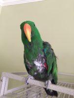 He is very friendly, though shy with strangers—has never bitten anyone. Loves almonds (lure food) does not talk, but makes flock calls and loud clicking sounds in response to his name. He doesn’t pluck, but does scissor his chest feathers. Tends to have a long tip on his beak.