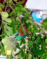 Sunshine is yellow and green (female). Schmoopie is dark blue (male) Both are very tame and know Up Up Up means get up on your finger.