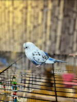 Pied blue and white male budgie. Has a white upper body and dark blue tail.