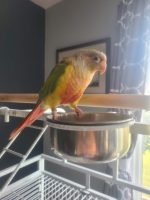 5 yr old Green Cheeked Conure. She’s very friendly and will answer to name. She does have a band on her leg.