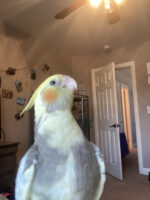 She whistles a lot, she has a white patch on her back that looks kinda like a heart, she loves cuddling but she is very shy sometimes