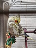 Cookie is a 1-year-old male. He’s currently molting, and he’s yellow/gray pearl. He is hand-raised, friendly with humans, but likely very frightened by his escape.