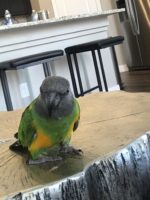 Mostly green with yellow. Grey head and yellow eyes. Not very friendly with strangers.
