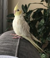 Tiger is a pale yellow female cockatiel with light brown tipped wing feathers. She’s 13 years old and very tame.
