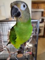 He’s a dusky conure, banded, has most of his flight feathers and loves sunflower seeds. He got spooked and flew off around noon. His recall is “arriba” though he’s scared of most people he’ll come if he’s hungry. The band is green, and he’ll try and kiss for food.