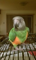 He will respond to his name by saying “Petey”, I believe that his band is purple or a faded purple.