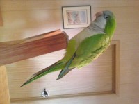 Green Quaker, blue flight and tail feathers, with a grey underside. Wings are not clipped. Has a leg band and his name is Rocky.