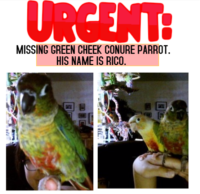 Has a funny waddle when he’s outside, enjoys chewing leaves and climbing bushes though I haven’t seen him climb a tree before. Has clipped wings. Last seen flying, he could’ve been lost in the woods or stolen, he does not respond when you call his name. 🙁 He usually doesn’t mind people even if he doesn’t know them and will take the pleasure in biting exposed ears and jewelry/glasses. He loves climbing people. Please contact me as soon as possible, time is of the essence.
