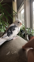 Lost Friday May 13 at about 2:00 when he flew out the door. He is mostly white with gray pied coloring (picture attached). Makes a high pitched whistle type call and talks.