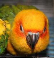 Sun Baby disappeared while I was on vacation for a few days. She escaped her cage and my pet sitter couldn’t find her. Her right foot was injured as a baby and so although she can perch, her walk is slightly crippled. Her toes on that foot turn inward too far. She wears a purple band, owner will supply complete band information.