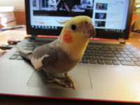 Our bird flew away from his cage (June 21). It is a parrot (cockatiel) as shown on the photo with a band on his leg. We call him BIRDY. He is close to people, he likes to fly to your head and shoulders, and he loves to whistle.