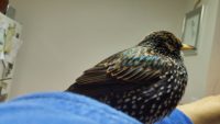 Bibi is a human imprint will not likely be accepted by wild starlings , so may be seen alone . If you have her please don’t release thinking she’ll be ok . She is a mimic who can say her name and a few other words , phrases and favorite sounds , Hope is that she has or will approach a human , she may well land on your arm or hand if presented . Starlings resemble parrots in that they are not comfortable flying down from heights . They are omnivores , Bibi is fond of french fries , burgers , bread ,fresh greens ,pasta . Her right foot is slightly smaller than her left . Bibi often sleeps with her head tucked and or on one foot .