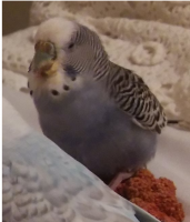 She is a violet-gray budgie with white and black striations on wings. Her wings are unclipped. She is eight years old and has a predisposition towards respiratory infections. She is unsocial and will probably not respond to her name, and may try to nip if cornered. When seen, she was favoring branches about 6′ off the ground. She is not banded or chipped. She may or may not respond to the sound of other budgies.