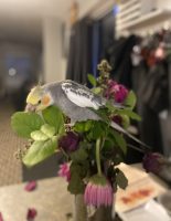 He says pretty bird, what’s up pretty bird, makes kissing noises and a god awful car alarm noise. He has lost more of the white pearling feathers from the photo I posted.