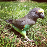 Gray and green with a yellow nose and vibrant blue back, not familiar with flying so seems very clumsy. Familiar with human interaction, but scared, so it is best to entice him with his favorite junk foods such as Cheetos and Cheez-its, then notify the owner to come retrieve him.