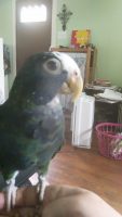 White patch of feathers on head, with a few tiny green feathers in the white. Body dark green and blue with red underneath tail. One year old bird.
