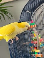 His name is Ricky he is extremely friendly, he is the sweetest soul, he loves cereal, he can’t fly for long,l. He gets tired quickly, he will respond to his name. He is the brightest yellow his wing span is about 2 feet. He flew away on September 5th