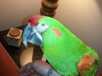 Zachary is a typical macaw at home that loves her owner but is shy around new people. She is about 10 inches tall with very long blue colored tail feathers. Her primary feathers on her wings are also blue. She loves peanuts and almonds and does say a few words. Her favorite sayings are “hello sweetheart”, “cracker” and “what”. Her wings are not clipped and she does have one yellow feather on one of her wings.