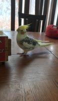 Hand raised from baby. Fed from our hands from the beginning. Hardly ever in her cage except to sleep because she loves people. Loved all animals and kids. Hung out on our shoulders. Loves to spread things too 🙂 and all her toys. Sings tunes nonstop!! (which I won’t disclose just yet) and responds to handful of commands. Miss her so much. This she is a he, but she was so small when we got her that we didn’t know the sex at the time so we named it Kaytee. Flew out sliding glass door 4/24/20 when wings weren’t clipped down due to quarantine (vets were closed at the time except for emergencies). We were devastated watching her fly out!! She’s a toddler!